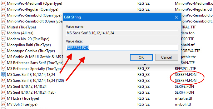จากนั้นเพิ่ม/แก้ไขให้ค่า MS Sans Serif เป็นดังนี้: